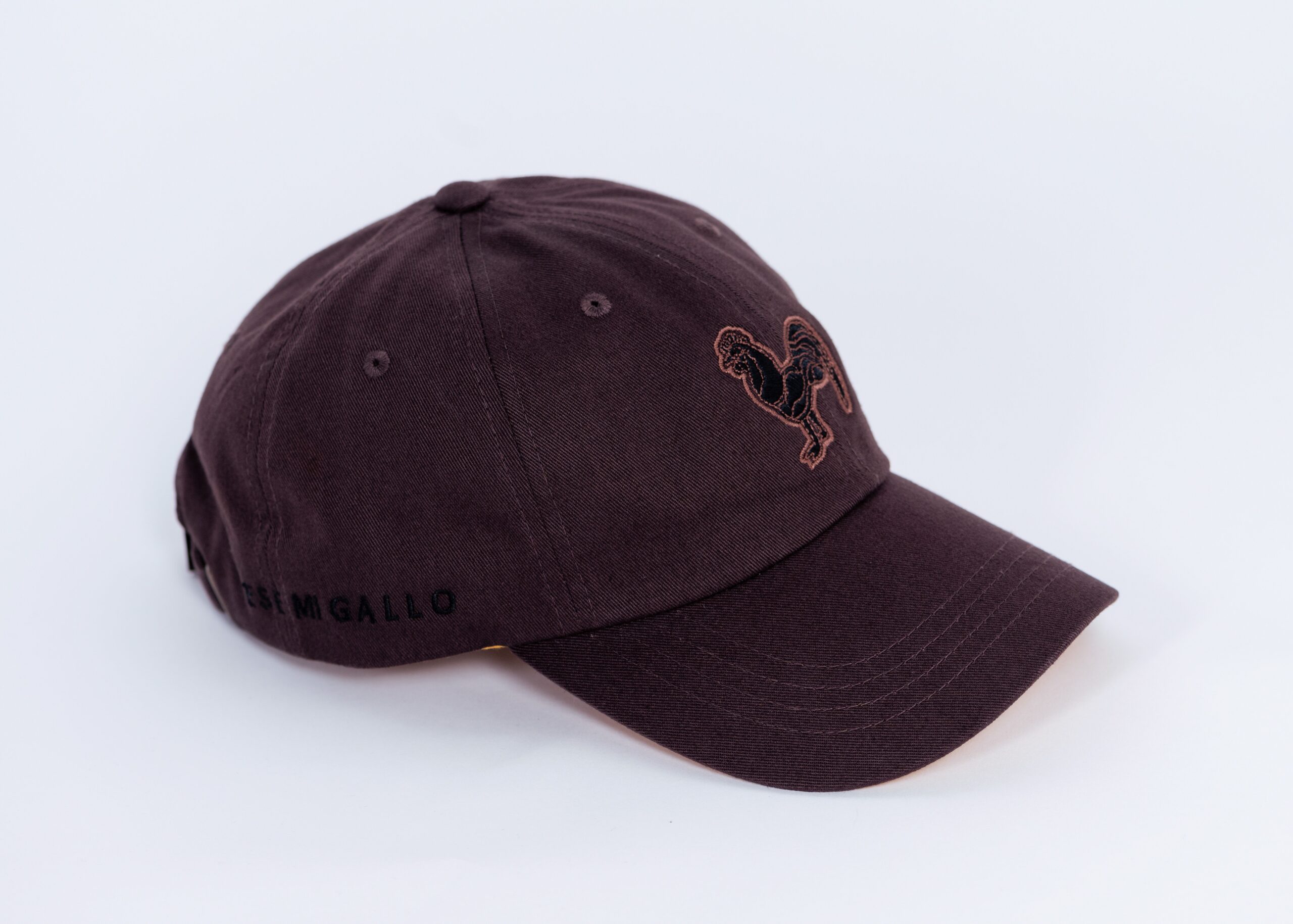 Gorra 100 % Algodón en color Café / Interior Amarillo, hebilla metálica ajustable, estilo tipo «Baseball cap» con bordado al frente y letras en lado derecho. Unitalla.