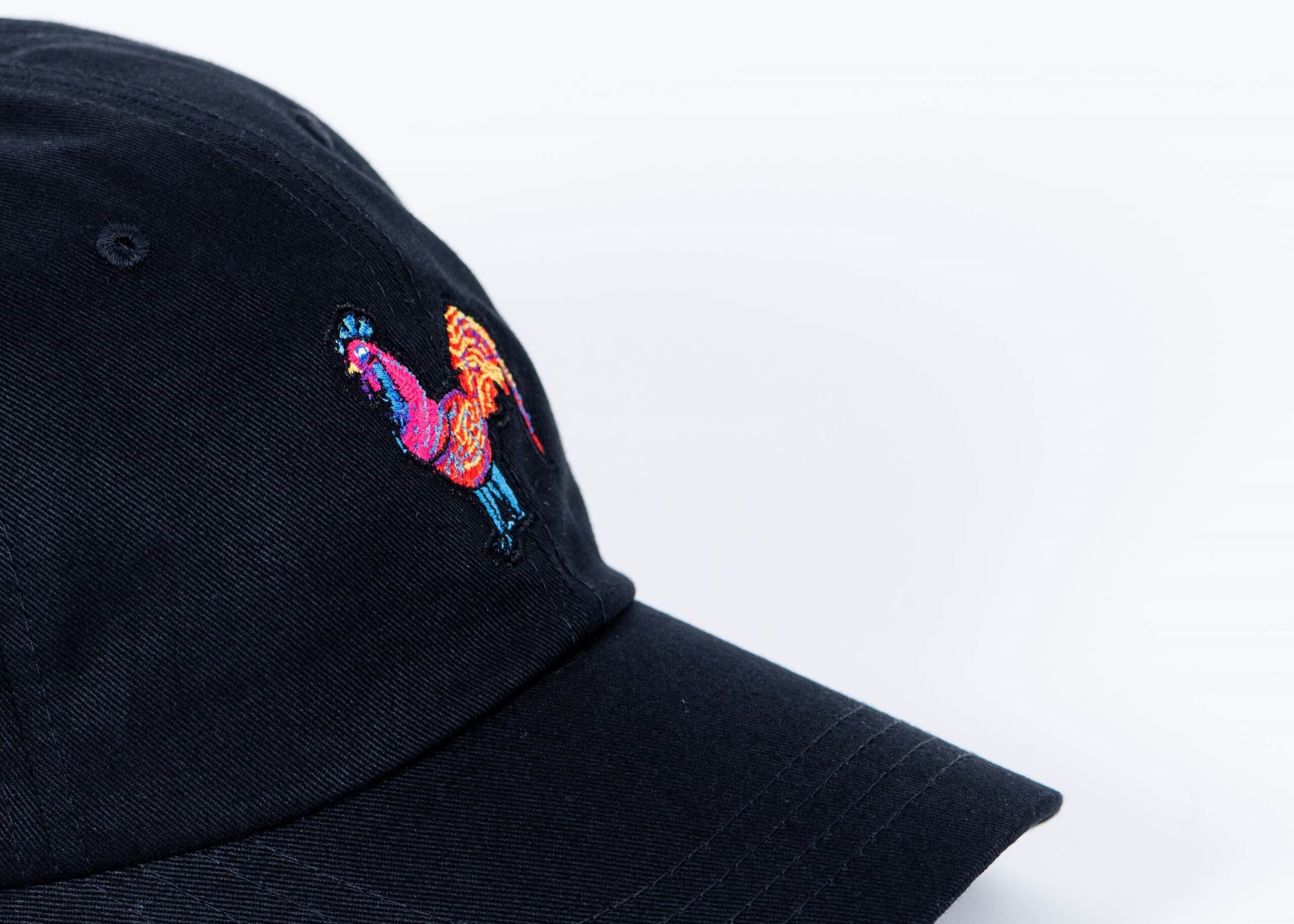Gorra 100% Algodón en color Negro, hebilla metálica ajustable, estilo tipo «Baseball cap» con bordado al frente de Gallo Original y letras en lado derecho. Unitalla .