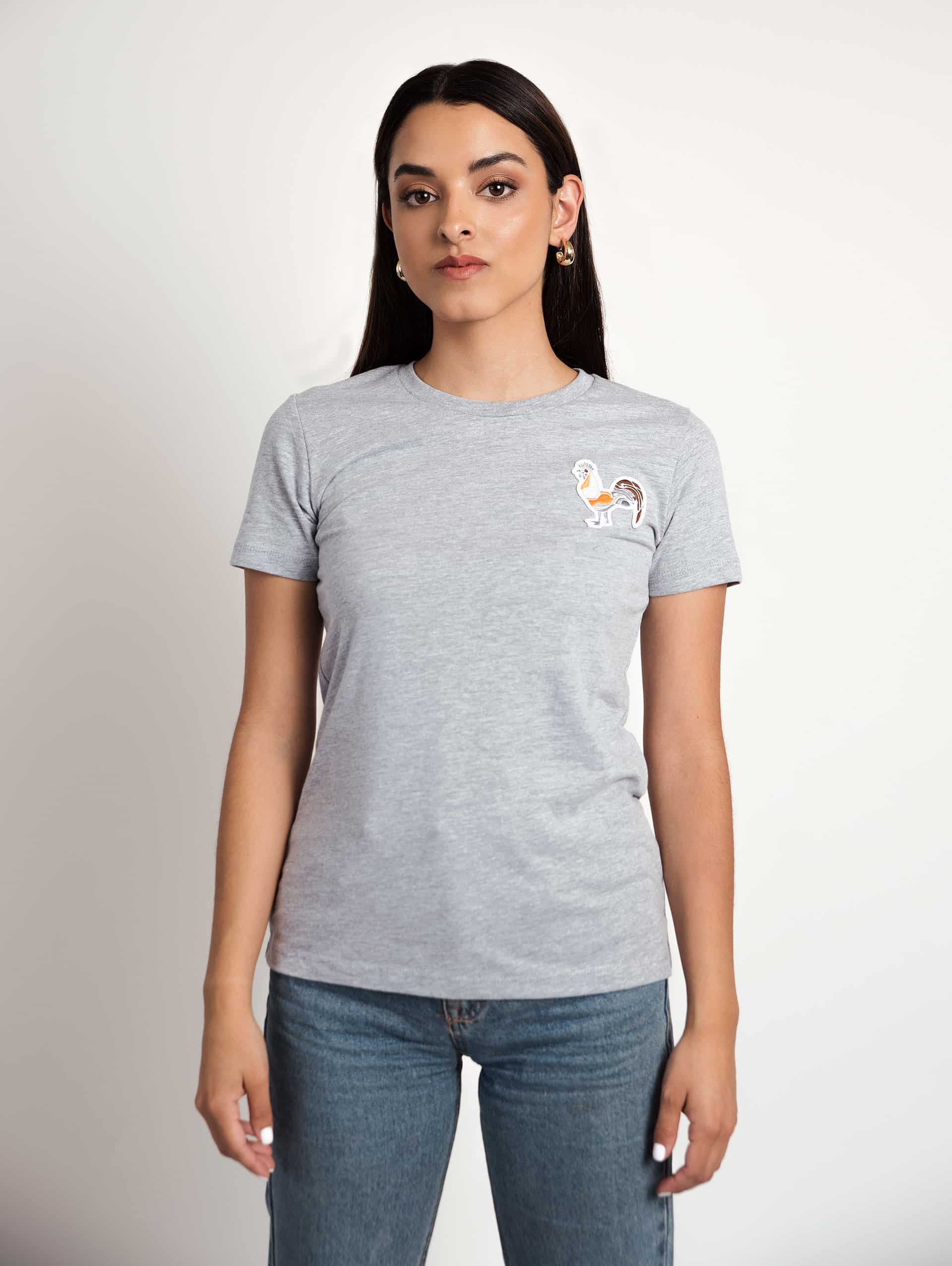 Playera 100% algodón en color gris. Parche (6.8×6.6cm) bordado en tonalidades Gris, Naranja y Café en lado izquierdo del pecho.